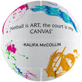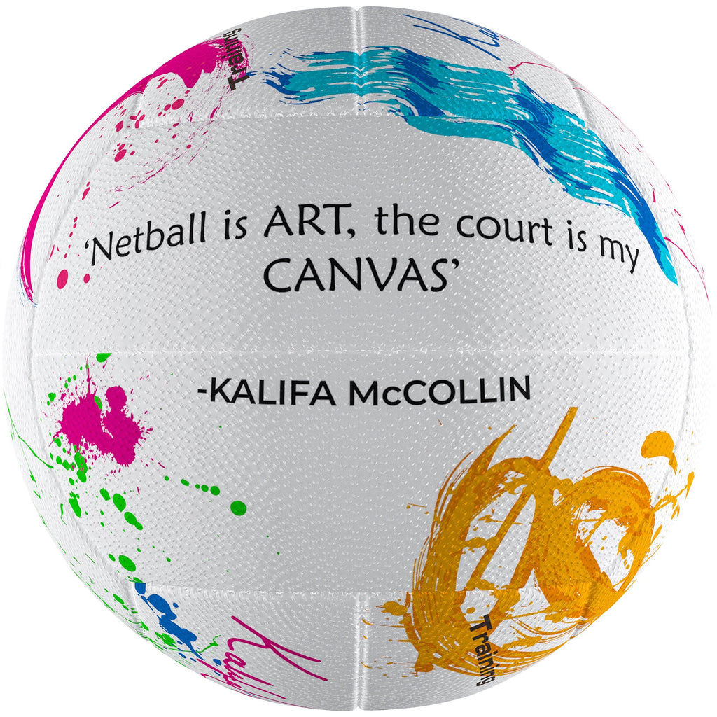 Trinidad and Tobago and Celtic Dragons Goal Attack, Kalifa, designed her signature ball features with a white background featuring bright bursts of colour all over the ball. The inspiring words: 'Netball is ART, the court is my CANVAS.' is writen on the back of the ball.
