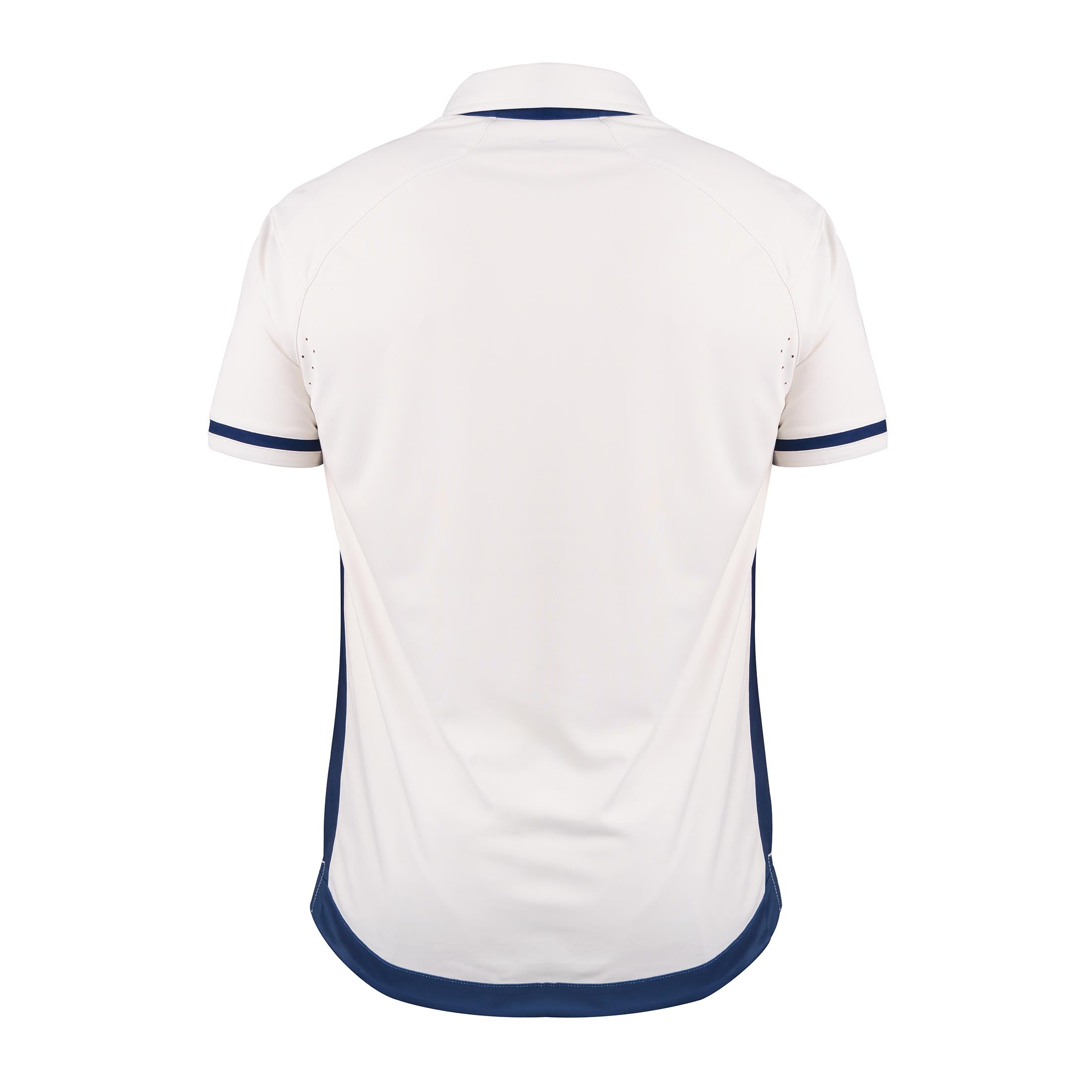 - Contrast tipping on the inner edge of the collar, extended placket edge and panel inserts at the cuff.